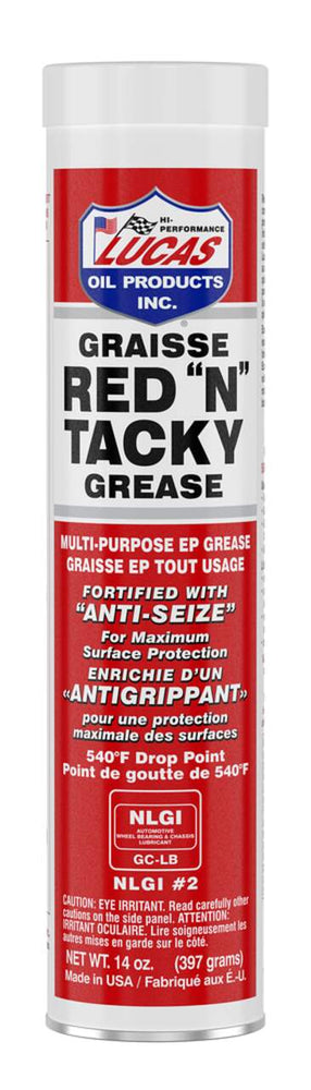The Lucas Oil Red "N" Tacky Grease Cartridge is a multipurpose, red lithium complex grease suitable for a variety of applications. With a smooth, tacky texture, this cartridge is fortified with rust and oxidation inhibitors, making it ideal for agricultural, automotive, and industrial applications. The cartridge weighs 14 oz and boasts excellent mechanical stability and a long storage life. The grease is also water-resistant, ensuring durability in various conditions.